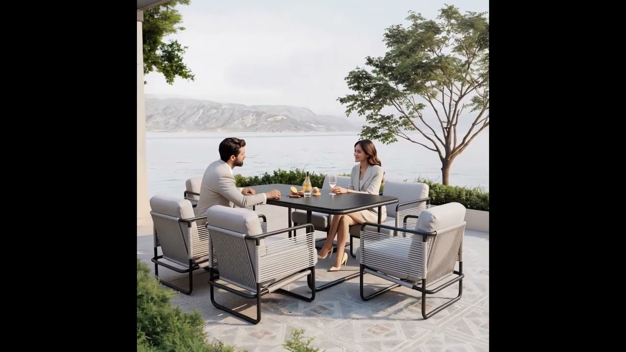 Das harmonische Zusammenspiel von hellgrauen Polstern, anthrazitfarbenem Gestell und schwarzer Glasplatte sorgt für einen zeitlos modernen Look. Die klaren Linien und das elegante Rope-Design verleihen der Essgruppe einen exklusiven Charakter, der perfekt zu modernen Outdoor-Living-Konzepten passt. |